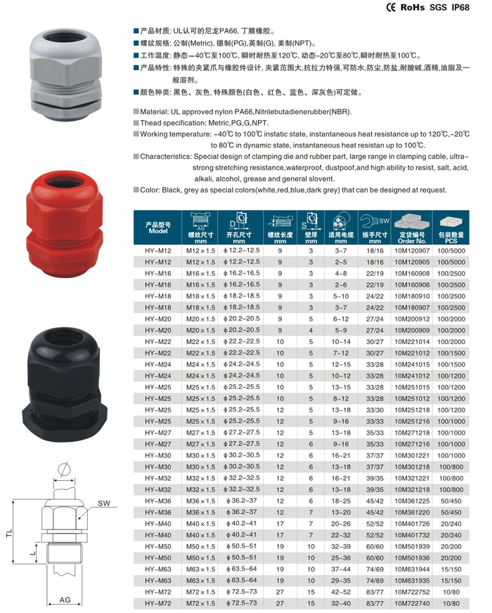 塑料固定電纜防水接頭HY-M系列產品供應商-樂清市鴻越連接器,本公司還生產電纜接頭, 防水接頭,電纜防水接頭,塑料固定電纜防水接頭HY-PG-R型(防折彎),塑料固定電纜防水接頭HY-M 型,塑料固定電纜防水接頭HY-NPT型,軟管防水接頭HY-R型等產品的廠家, 是一家集研發(fā)、生產、銷售于一體的專業(yè)化現代企業(yè)。憑借優(yōu)良的技術性能和高效的質量保證,滿意周到的銷售服務,合理實惠的防水接頭價格,其各項技術指標和產品性能均領先于同行,廣泛應用于接線盒、配電柜、通訊設備、儀器儀表、醫(yī)療器械、機床機械等多個領域;不斷推陳出新,研發(fā)新品,形成多系列高規(guī)格的格局,有效拓寬了企業(yè)的市場渠道,增強了市場競爭力,為擴大企業(yè)規(guī)模奠定了基礎。